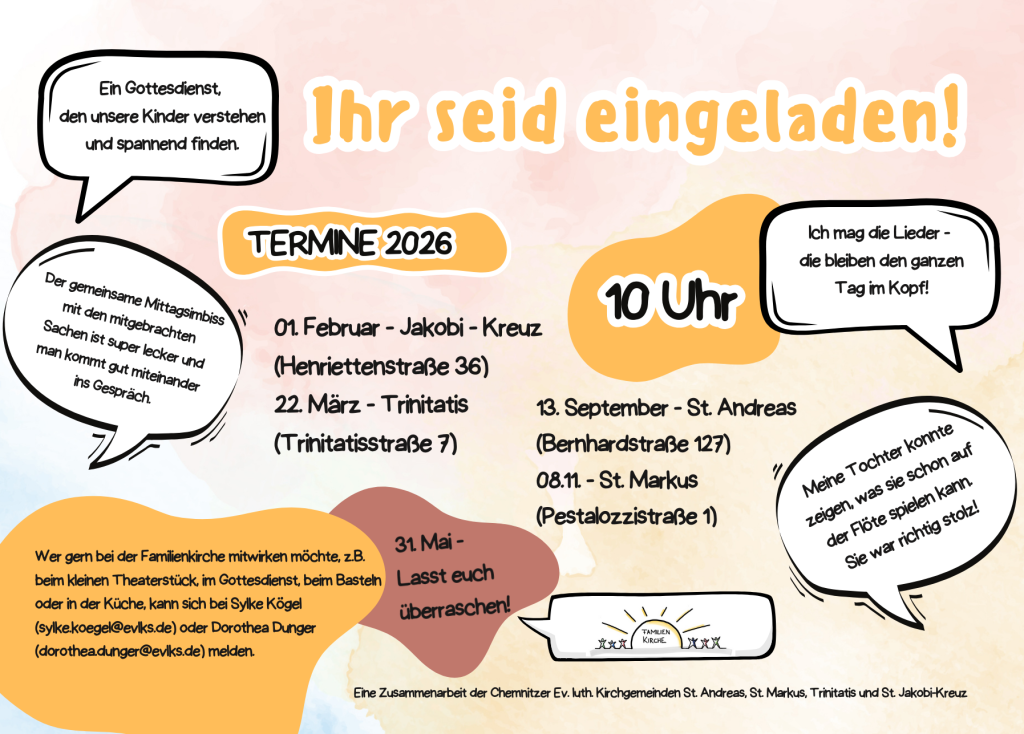 Kindergottesdienste finden in unserer Kirchgemeinde statt. Darüber freuen wir uns sehr! Alle Kinder und Familien sind recht herzlich eingeladen, sonntags um 09:30 Uhr in die Kreuzkirche zu kommen!