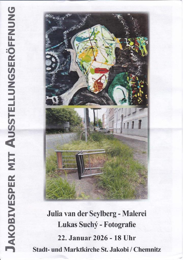 Seit einer Reihe von Jahren hat sich die Jakobikirche zu einem viel beachteten Ausstellungsort entwickelt. Was zunächst unter mehr oder weniger improvisierten Bedingungen begann, hat seit der Fertigstellung des Kirchenschiffes 2009 nun auch einen würdigen äußeren Rahmen gefunden. Der inhaltliche Schwerpunkt liegt auf der Vermittlung geistiger und geistlicher Werte mit den Ausdrucksmöglich-keiten der bildenden Kunst in ihren verschie-denen Gattungen: Grafik, Malerei, Fotografie und Plastik. Auch die künstlerische Auseinandersetzung mit kirchlichen und gesellschaftlichen Fragen der Gegenwart ist ein wichtiges Anliegen unseres Ausstellungs-programms. Ein Arbeits-kreis der Kirchgemeinde organisiert jährlich etwa sechs Expositionen mit Künstlerinnen und Künstlern aus der Region, aber auch darüber hinaus.